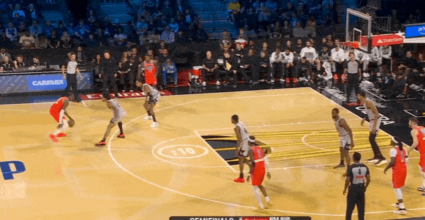半场最后一攻,自行上线持球压时间,三分线外一步超远三分抬手就进。